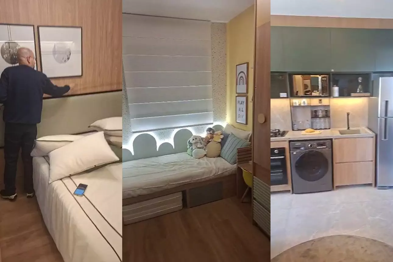 - Apartamento decorado: Sala, cozinha, dormitórios, banheiros, adornos, mobiliário e eletrônicos.